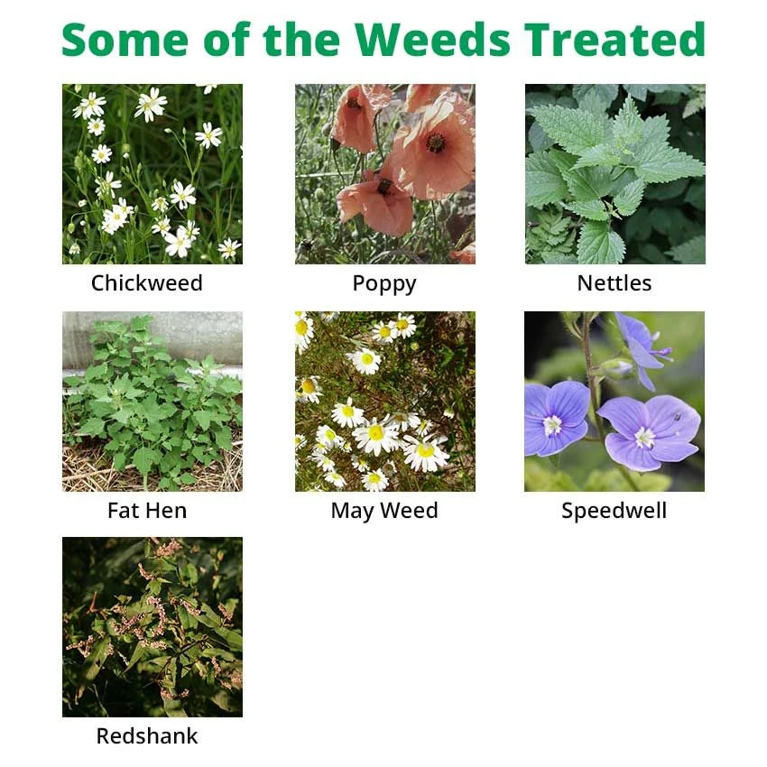 Susceptible weeds: Chickweed, Speedwell, Hemp-nettle, Poppy, Fat Hen, Redshank, Mayweed, small nettle and many others.